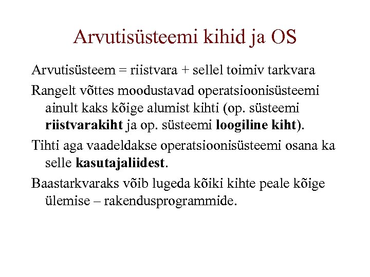 Arvutisüsteemi kihid ja OS Arvutisüsteem = riistvara + sellel toimiv tarkvara Rangelt võttes moodustavad operatsioonisüsteemi ainult kaks kõige alumist kihti (op. süsteemi riistvarakiht ja op. süsteemi loogiline kiht). Tihti aga vaadeldakse operatsioonisüsteemi osana ka selle kasutajaliidest. Baastarkvaraks võib lugeda kõiki kihte peale kõige ülemise – rakendusprogrammide.
