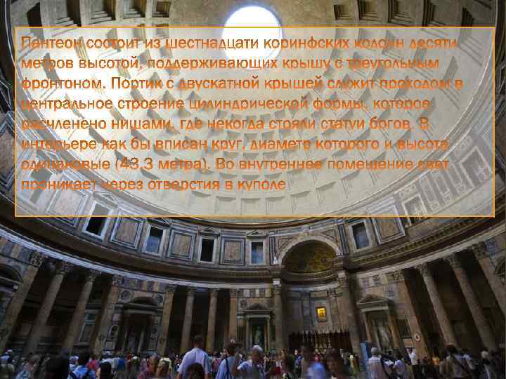 ПАНТЕОН – «ХРАМ ВСЕХ БОГОВ» Пантеон (греч. "храм, посвященный всем богам") - единственное сохранившееся в Риме до наших дней практически неповрежденным, величайшее античное купольное сооружение высотой 43 м.