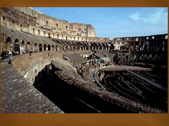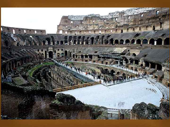 Колизей ВНУТРИ - Амфитеатр вмещал около 50. 000 -70. 000 зрителей, рассаживающихся на его ступеньках в зависимости от класса социальной принадлежности. Существовало три разряда мест: "подиум", попадающий в первый разряд, куда садились представители самого высокого сословия и где находилась ложа императора; вторая категория мест, в центре, отведенных для "цивис", граждан, принадлежащих к среднему сословию и третья, "сумма", где размещался народ. Существовала, вероятно, еще и четвертая категория мест, отведенных для женщин. Под ареной существовала целая система клеток, галерей, складских помещений, раздевальных и подвалов, ныне явившихся взору благодаря проведенным раскопкам. Речь идет о целом ряде помещений, где хранились раз- личные предметы и механизмы и где содержались животные до и после зрелищ, основными видами которых являлись бои гладиаторов ("луди") и "венатионес", охота на животных; но на арене происходили, также, и выступления фокусников, спортивные состязания, конные турниры и морские битвы - навмахии. Игры проводились по случаю знаменательных дат, ежегодных праздников и чрезвычайных событий. В одних случаях это происходило в дни рождения императора и празднования исторических событий, а в других - в результате триумфа или победы. Следует сказать, что похороны тоже являлись поводом для проведения подобного рода игр.