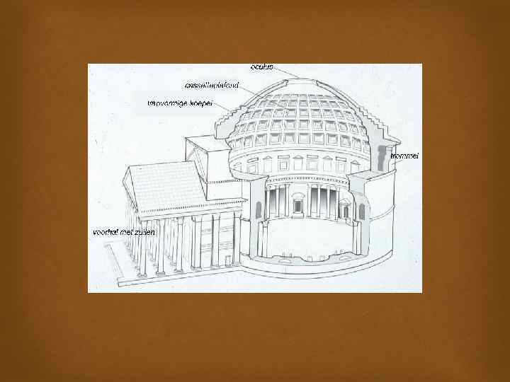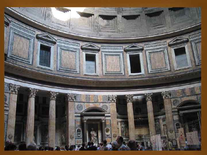 Пантеон Первая версия Пантеона была построена в 27— 25 гг. до н. э. императором Агриппой. Пантеон Агриппы сгорел во время пожара 80 года. В 125 г. император Адриан выстроил новое здание Пантеона, полностью реконструировав его. Снаружи Пантеон представляет собой огромный цилиндрический объем, к которому пристроен глубокий портик с шестнадцатью коринфскими колоннами двенадцатиметровой длины, вытесанными из асуанского гранита. В стенах портика были сделаны ниши, предназначенные для статуй богов или императоров. Фронтон был некогда украшен бронзовой скульптурой, изображающей битву титанов. В древности в Пантеон входили через стоявшую на его площади триумфальную арку. Внутри Пантеонимеет двухъярусную стену с колоннами и нишами, прорезанную сводчатыми арками. На втором, меньшем и более плоском ярусе покоится купол. Изнутри куполпокрывают пять рядов перспективных кессонов (квадратных углублений), вверху же заканчивается девятиметровым проемом — окулусом.