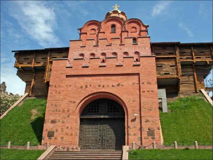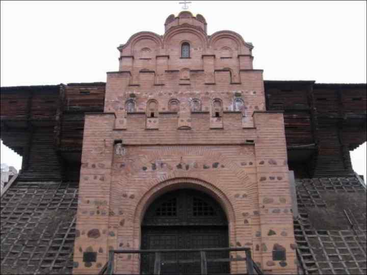 Ярослав Мудрый окружил Верхний город мощными оборонными укреплениями, которые имели трое ворот. Самыми монументальными и торжественными, служившими одновременно главным и парадным въездом и крепостным сооружением были золотые ворота, построенные одновременно с Софией. Высота проезжей части ворот составляла 12 м, а ширина 6, 9 м. проезд завершала церковь Благовещения с позолоченным куполом. Отсюда, очевидно, ворота и получили свое название «Золотые» . Разрушенные веками и вражескими нашествиями, Золотые ворота в XVII веке представляли собой живописные руины, хотя в то время над стенами еще сохранились остатки церкви Благовещения.