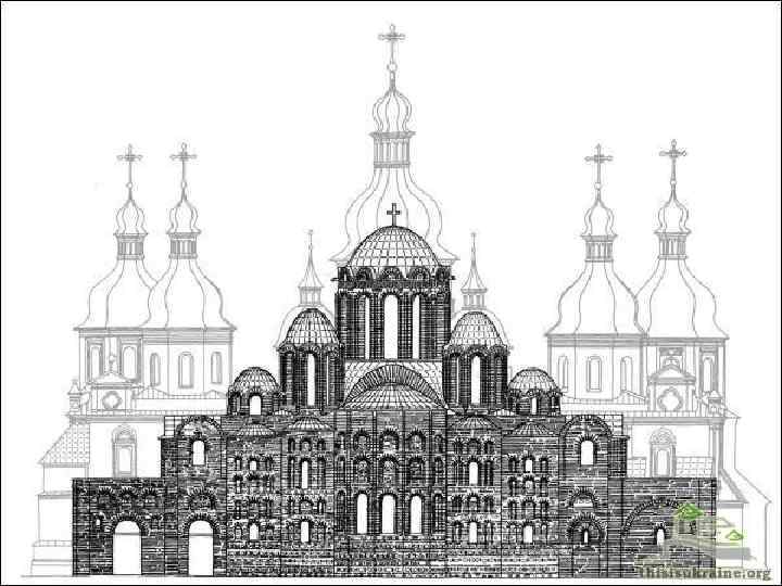 Первоначальный облик Собор строился константинопольскими строителями, при участии киевских мастеров. Пятинефный крестово-купольный храм с 13 главами. Собор имел пирамидальную композицию. Собор сложен в византийской технике из чередующихся рядов камня и плинфы (широких, тонких кирпичей), снаружи кладка была покрыта раствором-цемянкой. Длина собора без галерей 29, 5 м, ширина — 29, 3; с галереями: 41, 7 и 54, 6. Высота до вершины главного купола 28, 6 м, величина центрального подкупольного квадрата 7, 6 м.