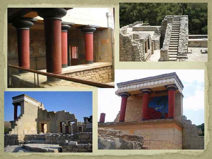 Основные архитектурные приемы: Главное – сквозное пространство, а не стены; движение, но не укрытие. Дома имеют прямоугольный план Центральный зал большого дома - мегарон В образовании форм критской архитектуры большую роль играли сейсмоустойчивые конструкции. Низ стен выкладывался из крупных каменных блоков – ортостатов, затем устанавливался деревянный каркас, заполняемый сырцовой кладкой или бутовым камнем на глиняном связующем. Каркасная система позволяла делать в стенах много проемов и возводить 2 – 3 – этажные ступенчатые здания на участках с уклоном. Деревянные связи, усиливающие сейсмостойкость, вводились в стены из сырца и из тесаного камня (во дворцах и богатых домах) Плоские крыши служили террасами.