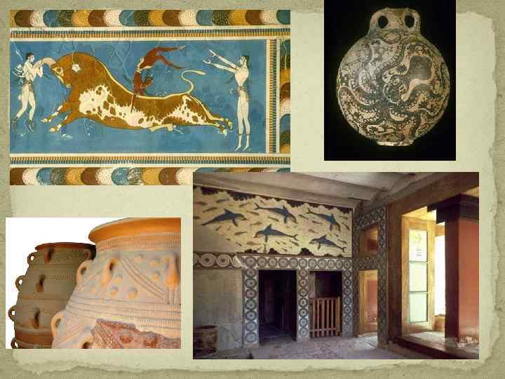 Архитектурные особенности дворцов: Критские дворцы представляют собой сложные комплексы, соединяющие разнообразные группы помещений (инсулы). Помещения для производства, для хранения припасов и ценностей, для жилья правителей, для парадных приемов и пиров объединяются в каждом из дворцов вокруг центрального двора. В комплекс сооружений включены и хозяйственные помещения, значительная часть дворца отводится для женщин. Это уже не дворец-крепость, а представительское сооружение. Архитектура дворца формировалась перистильными дворами, открытыми колонными залами, лоджиями, создававшими живописные сочетания пространств, игру света и тени.