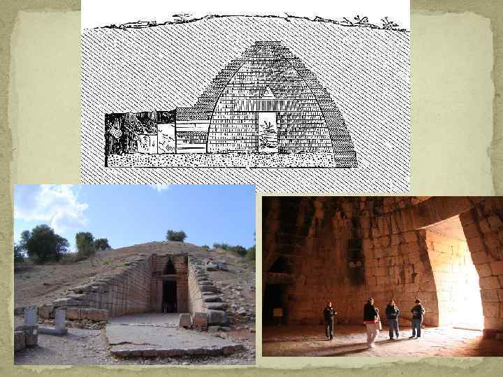 Большим своеобразием отличались микенские погребальные сооружения. Купольные гробницы (толосы), представляющие собой круглые сооружения, крытые куполом, который образуется концентрическими рядами кладки с напуском. К круглой камере ведет узкий коридор (дромос). Лучше других сохранившаяся купольная гробница 14 в. до н. э. в Микенах названа «сокровищницей Атрея» , по имени царя Агамемнона, героя Троянской войны. Вход в гробницу сложен из правильных каменных квадров; дверной проем, слегка суживающийся кверху, покрыт огромной монолитной плитой (около 120 тонн весом), над которой продолжается кладка, образующая треугольное отверстие для облегчения стены над поперечной плитой.