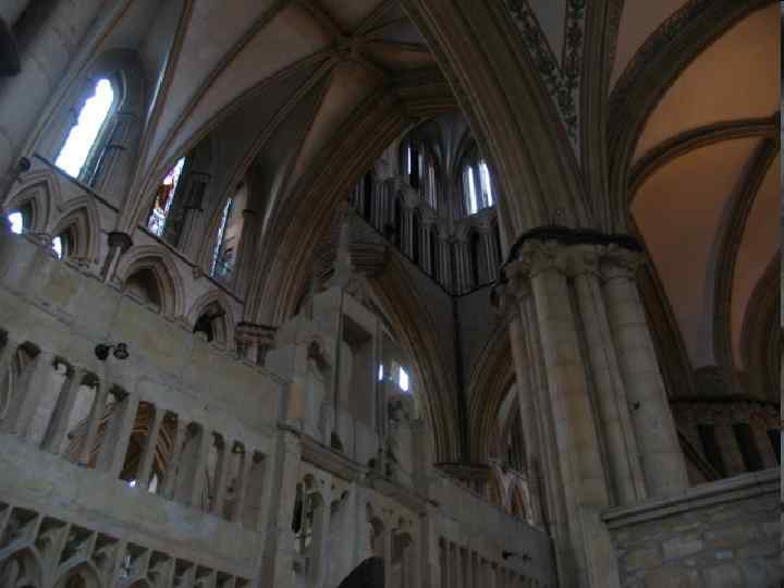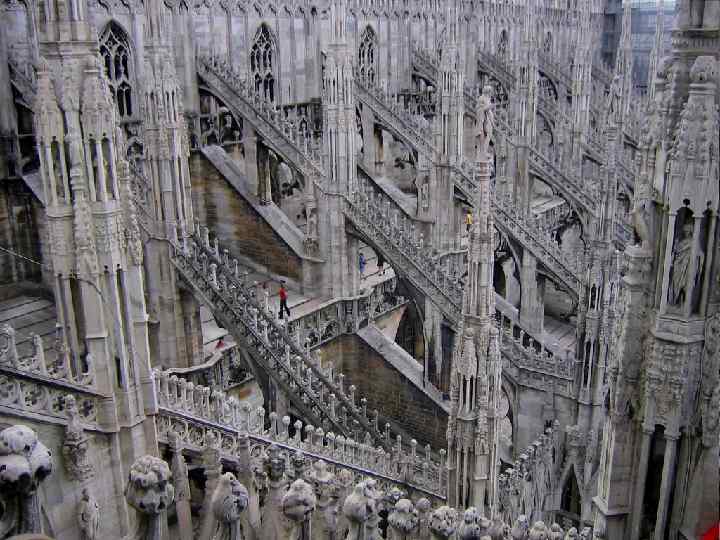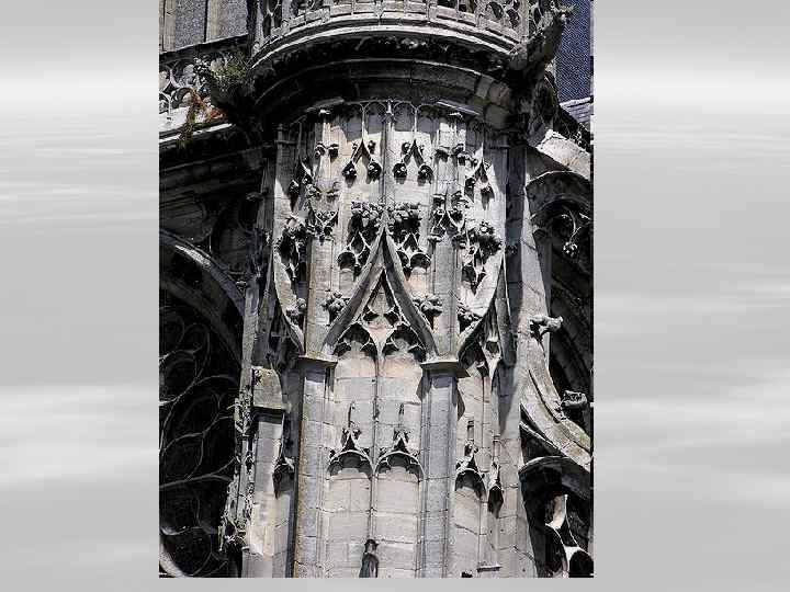 Единственная массивная часть готич. здания – главный фасад, на котором располагались 2 огромные башни, переходящие в тонкий шпиль. Готич. соборы очень нарядно и богато декорированы: остроконечные башенки, остроугольные или резные ажурные фронтоны, вертикальные опоры имеющие вид пучков тонких колонок, остроконечные фронтонами.