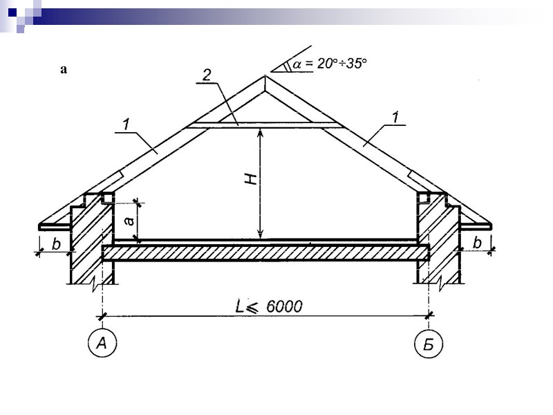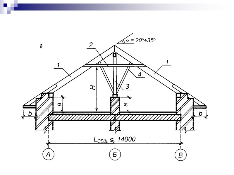 Рис. 15. Конструктивные схемы скатных крыш: а – с висячими стропилами; б – с наслонными стропилами; в – с наслонными стропилами переменного уклона (35°÷60°); г – с наслонными стропилами переменного уклона (60° ÷ 70°): 1 – стропильная нога; 2 – ригель; 3 – стойка; 4 – подкос