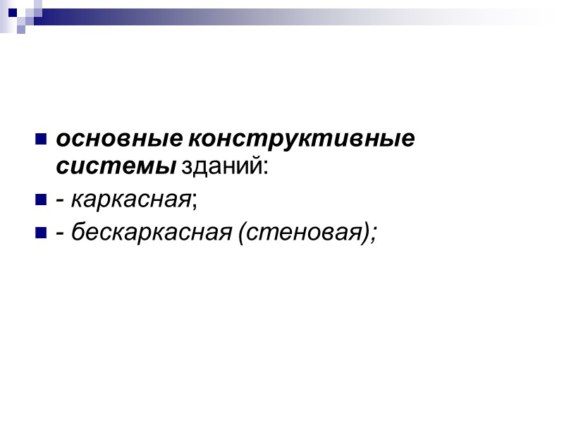 основные конструктивные системы зданий: - каркасная; - бескаркасная (стеновая);