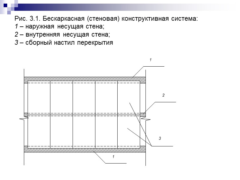 Рис. 3.1. Бескаркасная (стеновая) конструктивная система: 1 – наружная несущая стена; 2 – внутренняя несущая стена; 3 – сборный настил перекрытия