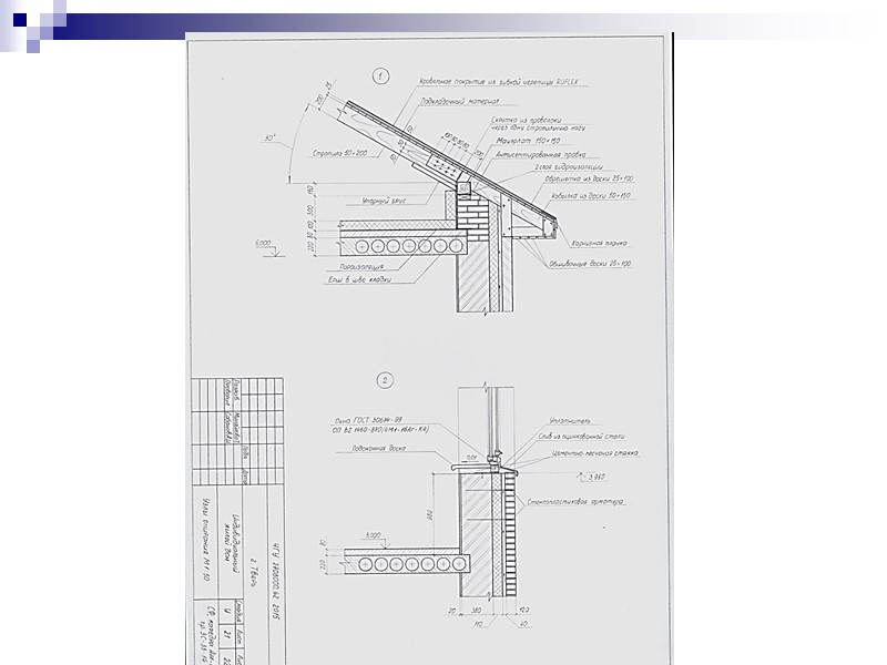 Рис. 17. Узел сопряжения скатной крыши и наружной стены жилого дома с мансардой: 1 – мауэрлат (опорный брус сечением 150×150 мм); 2 – стропильная нога (доска сечением 200×50 мм, поставленная на ребро); 3 – кобылка (доска сечением 100×32 мм, поставленная на ребро); 4 – подшивка карниза (доски сечением 100×25 мм); 5 – карнизный щит (доски сечением 150×50 мм); 6 – обрешетка (брусья сечением 50×50 мм); 7 – кровля