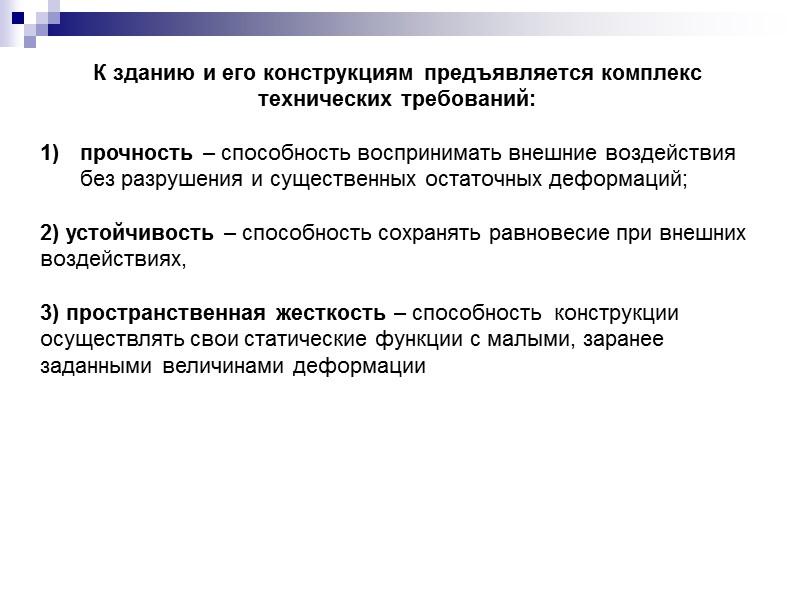 К зданию и его конструкциям предъявляется комплекс технических требований: прочность – способность воспринимать внешние воздействия без разрушения и существенных остаточных деформаций; 2) устойчивость – способность сохранять равновесие при внешних воздействиях, 3) пространственная жесткость – способность конструкции осуществлять свои статические функции с малыми, заранее заданными величинами деформации