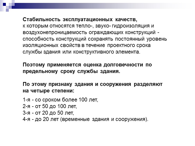 Стабильность эксплуатационных качеств, к которым относятся тепло-, звуко- гидроизоляция и воздухонепроницаемость ограждающих конструкций - способность конструкций сохранять постоянный уровень изоляционных свойств в течение проектного срока службы здания или конструктивного элемента. Поэтому применяется оценка долговечности по предельному сроку службы здания. По этому признаку здания и сооружения разделяют на четыре степени: 1-я - со сроком более 100 лет, 2-я - от 50 до 100 лет, 3-я - от 20 до 50 лет, 4-я - до 20 лет (временные здания и сооружения).