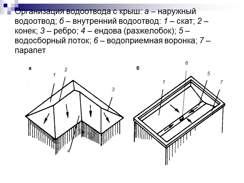 Организация водоотвода с крыш: а – наружный водоотвод; б – внутренний водоотвод: 1 – скат; 2 – конек; 3 – ребро; 4 – ендова (разжелобок); 5 – водосборный лоток; 6 – водоприемная воронка; 7 – парапет