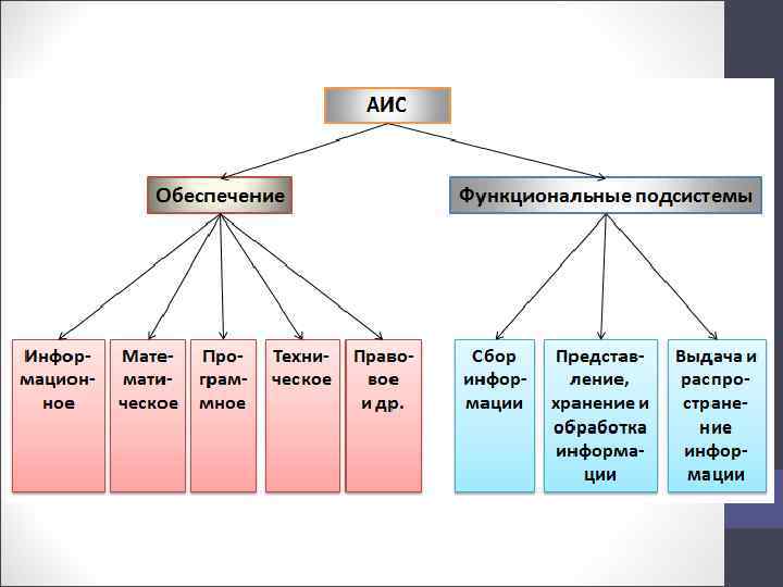 АИС состоит, как правило, из функциональной и обеспечивающей частей, каждая из которых имеет свою структуру. • Функция есть проявление взаимодействия системы с внешней средой. Проявление функции во времени называется функционированием. • Функциональная часть — совокупность подсистем, зависящих от особенностей АСУ. Эти подсистемы разделяются по определенному признаку (функциональному или структурному) и объединяют в себе соответствующие комплексы задач управления. • Обеспечивающая часть — совокупность информационного, математического, программного, технического, правового, организационного, методического, эргономического, метрологического обеспечения.