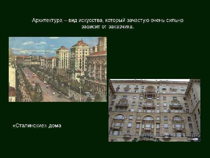 Архитектура как вид искусства § Основная цель – организация пространственной среды для жизни и деятельности человека. § Виды архитектуры: культовая, гражданская, промышленая § Средства решения: 1. материал, 2. конструкции. § Задачи: польза (функциональность), прочность (конструктивность), красота ( эстетичность). § Инструменты: пропорции, объемно-планировочное решение, силуэт. § Архитектоника – взаимосвязь и взаиморасположение несущих несомых частей, пропорции, цвет и т. п. Зависит от технического уровня строительства, эстетических идеалов, отражает культуру народа. § Архитектура зависит от строительной культуры, материалов, научно-технических знаний, философии общества и отражает мировоззрения конкретной части общества в конкретную эпоху.