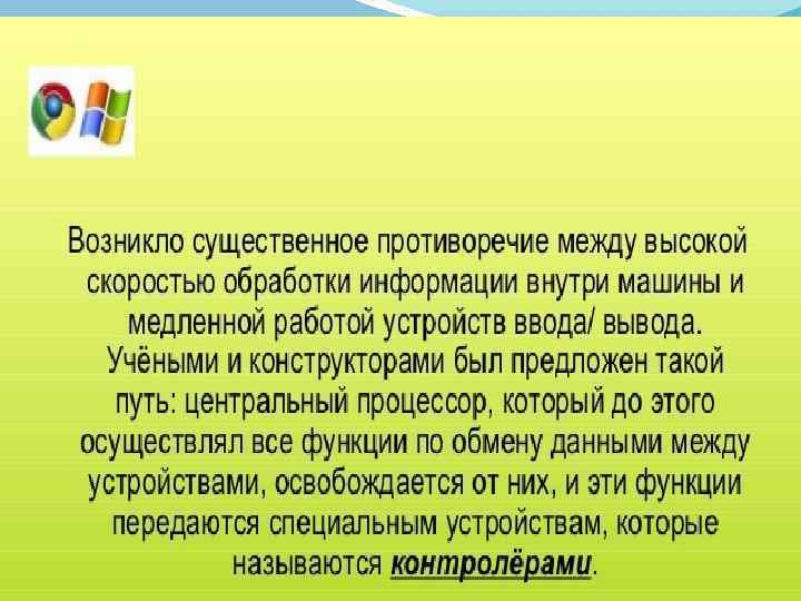 Контроллер - это специализированный процессор, управляющий работой внешнего устройства. Например, контроллер накопителя на магнитных дисках, контроллер клавиатуры.