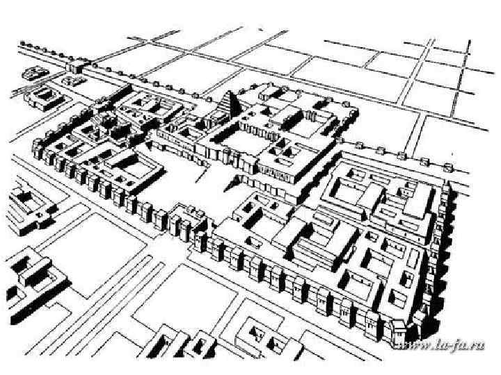 Резиденция Саргона II 1 - главный вход во дворец со стороны города; 2 -официальная часть дворца; 3 -служебные помещения; 4 -гарем; 5 -летнее жилище Саргона; 6 -зиккурат