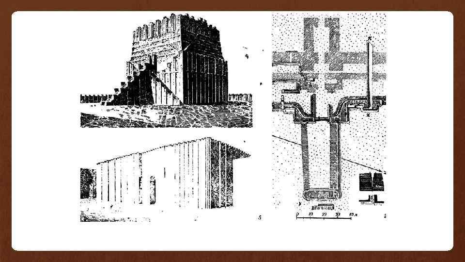 • Основным строительным материалом был кирпич -сырец, кирпич обожженный и глазурованный. • Основу всех конструкций составляли мощные многометровые стены, внешняя сторона которых расчленялась выступами, а верхняя часть имела зубчатое завершение. • Иногда наружную сторону стен облицовывали глазурованными кирпичами, образующими определенный орнамент или огромные изображения зверей. • Наряду с балочными перекрытиями из стволов пальмы часто устраивалось сводчатое перекрытие из кирпича. • В более поздний период, особенно в VII в. до н. э. , сводами перекрывались даже внутренние пространства жилых домов. • Культовые сооружения образовывали целые комплексы, доминантой которых являлся зиккурат — высокое ступенчатое сооружение, похожее на холм. На его вершине располагался храм, который, видимо, служил также обсерваторией. • Недалеко от храмового комплекса иногда, особенно в ранний период, располагался и дворец правителя. • Города и дворцы. Для защиты территории от вторжения неприятелей были необходимы хорошо укрепленные города; • даже каждая деревня была окружена технически сложными оборонительными стенами.
