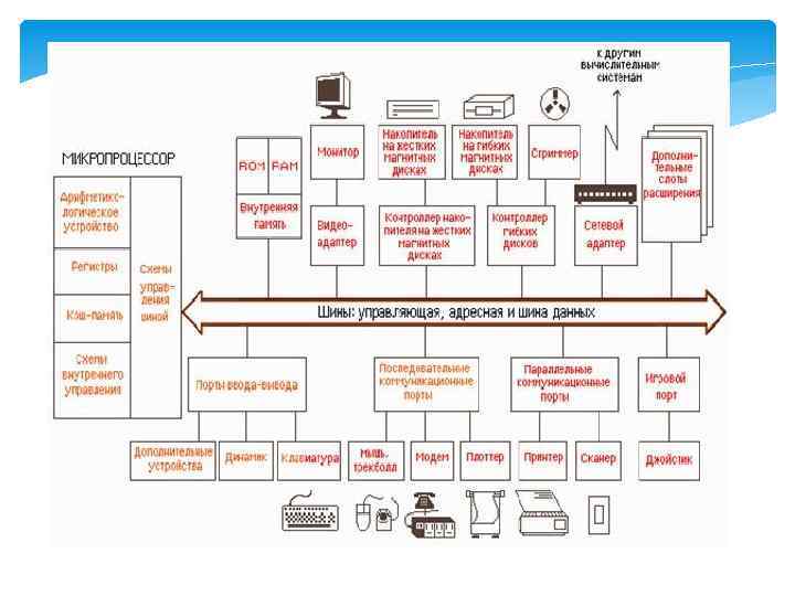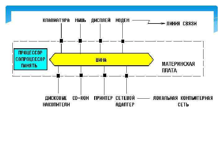 Устройства, связанные с процессором через шину, а не напрямую, называют периферийными Шина - канал передачи данных в виде проводников на печатной плате или многожильного кабеля