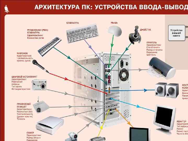 Устройства ввода графической информации • сканер • Видео- и веб-камера • Цифровой фотоаппарат • Плата видеозахвата Устройства ввода звуковой информации • Микрофон • Цифровой диктофон
