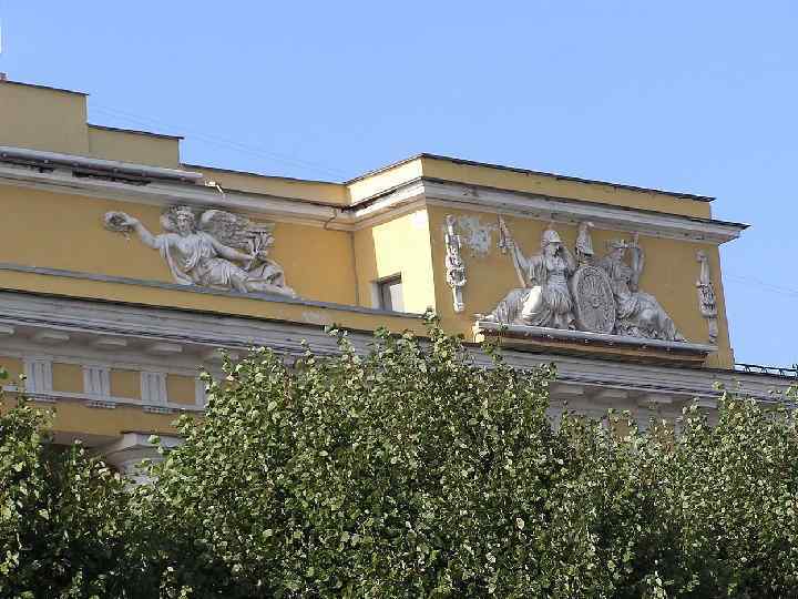 Скульптура n Захаров и сам разработал и план скульптурного убранства Адмиралтейства. n С двух сторон арки главного входа стоят морские нимфы - нереиды; их тела могучи и далеки от античного идеала. n Они несут на плечах небесные сферы, воплощая незыблемость мироздания.