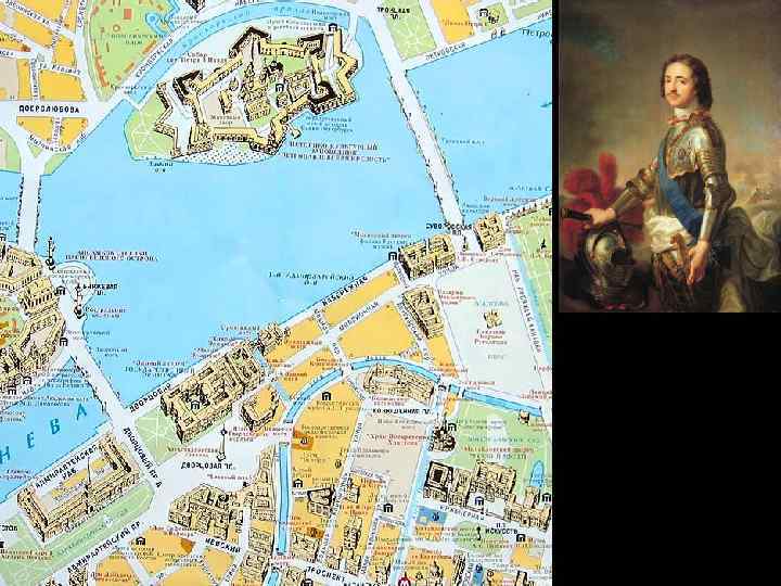 Петр I, Ламбер де Герен, Доменико Трезини. Петропавловская крепость в Петербурге. В 1703 -1704 гг. возведена земляная крепость, в 1706 -1740 гг. стены выложены кирпичом, в 1779 -1785 гг. облицованы гранитом. Крепость включает 6 бастионов, толщина стен 20 м, высота – 12 м