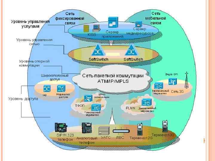 Задача уровня управления коммутацией обработка информации сигнализации маршрутизация вызовов управление потоками Уровень управления сетью отвечает за реализацию управления вызовами. Функция установления соединения реализуется на уровне элементов базовой сети под внешним управлением оборудования программного коммутатора (Softswitch).