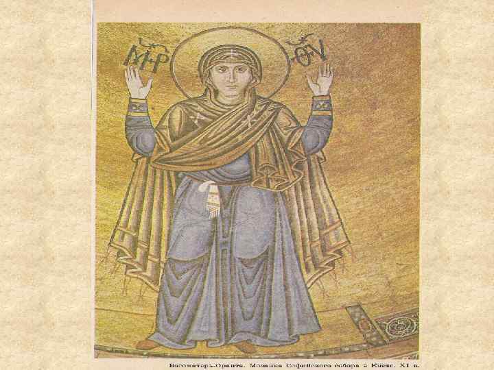 Внутренняя отделка храма неразрывно связана с архитектурной формой, она усиливает впечатление монументальности сооружения. Одним из шедевров Софии является фигура божьей матери – Марии - Оранты, выполненная в мозаике и помещенная на «конхе» , внутренней, сферической поверхности апсиды. В молитвенной позе, с поднятыми вверх руками, Мария обращается к Христу. Стоит она на широком помосте, украшенном драгоценными камнями. Различных оттенков синие одежды с черными складками выделяются из общей массы золотой смальты. Яркий, преобладающий в мозаике золотой цвет умело сочетался с приглушенными теплыми тонами мрамора, шифера.
