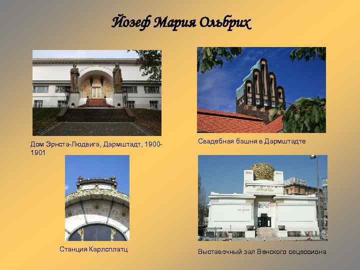 Йозеф Мария Ольбрих Дом Эрнста-Людвига, Дармштадт, 19001901 Станция Карлсплатц Свадебная башня в Дармштадте Выставочный зал Венского сецессиона