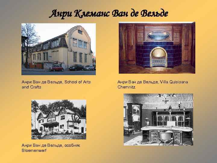 Анри Клеманс Ван де Вельде Анри Ван де Вельде, School of Arts and Crafts Анри Ван де Вельде, особняк Bloemenwerf Анри Ван де Вельде, Villa Quisisana Chemnitz