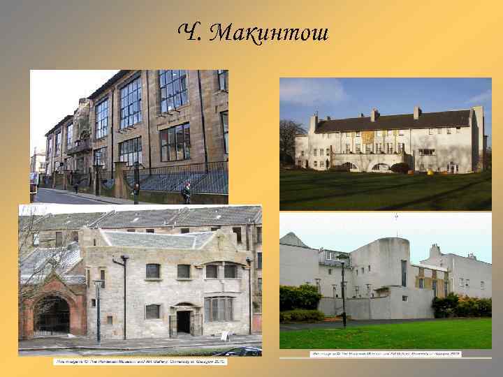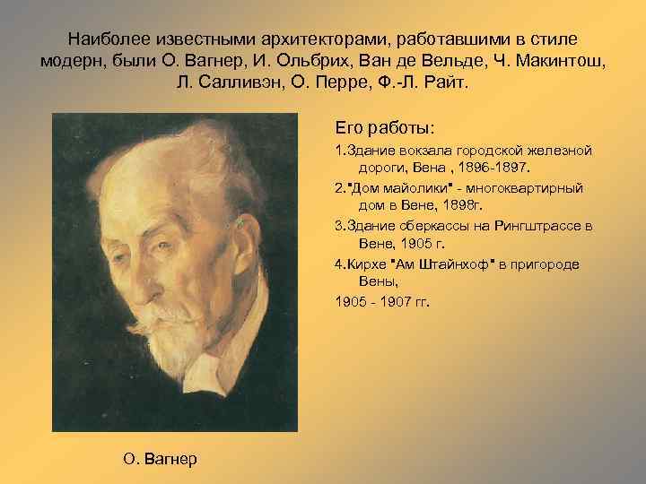 Наиболее известными архитекторами, работавшими в стиле модерн, были О. Вагнер, И. Ольбрих, Ван де Вельде, Ч. Макинтош, Л. Салливэн, О. Перре, Ф. -Л. Райт. Его работы: 1. Здание вокзала городской железной дороги, Вена , 1896 -1897. 2. "Дом майолики" - многоквартирный дом в Вене, 1898 г. 3. Здание сберкассы на Рингштрассе в Вене, 1905 г. 4. Кирхе "Ам Штайнхоф" в пригороде Вены, 1905 - 1907 гг. О. Вагнер
