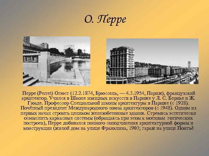 О. Перре (Perret) Огюст (12. 2. 1874, Брюссель, — 4. 3. 1954, Париж), французский архитектор. Учился в Школе изящных искусств в Париже у Л. С. Бернье и Ж. Гюаде. Профессор Специальной школы архитектуры в Париже (с 1928). Почётный президент Международного союза архитекторов (с 1948). Одним из первых начал строить целиком железобетонные здания. Стремясь эстетически осмыслить каркасные системы (обращаясь при этом к мотивам готических построек), Перре добивался полного соподчинения архитектурной формы и конструкции (жилой дом на улице Франклина, 1903; гараж на улице Понтьё