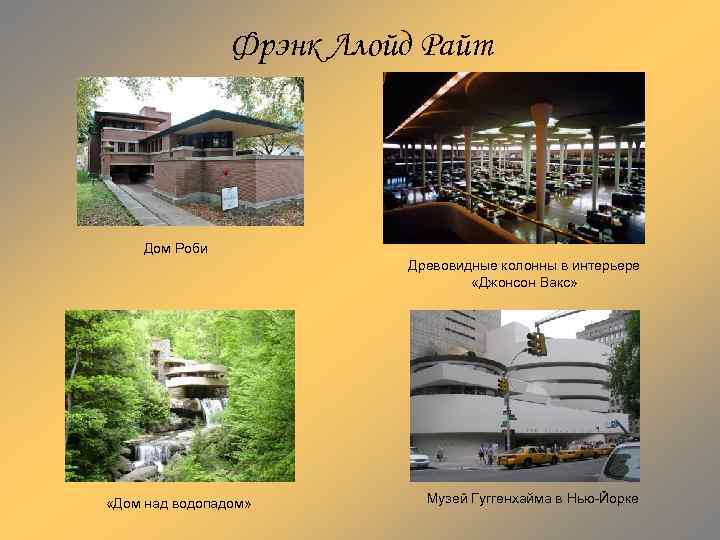 Фрэнк Ллойд Райт Дом Роби Древовидные колонны в интерьере «Джонсон Вакс» «Дом над водопадом» Музей Гуггенхайма в Нью-Йорке
