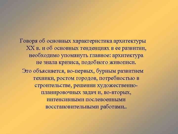 Говоря об основных характеристика архитектуры XX в. и об основных тенденциях в ее развитии, необходимо упомянуть главное: архитектура не знала кризиса, подобного живописи. Это объясняется, во-первых, бурным развитием техники, ростом городов, потребностью в строительстве, решении художественнопланировочных задач и, во-вторых, интенсивными послевоенными восстановительными работами. .