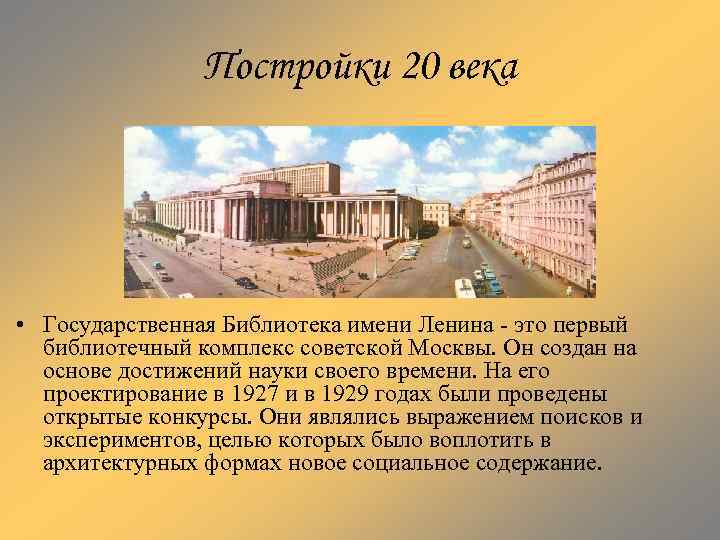 Постройки 20 века • Государственная Библиотека имени Ленина - это первый библиотечный комплекс советской Москвы. Он создан на основе достижений науки своего времени. На его проектирование в 1927 и в 1929 годах были проведены открытые конкурсы. Они являлись выражением поисков и экспериментов, целью которых было воплотить в архитектурных формах новое социальное содержание.