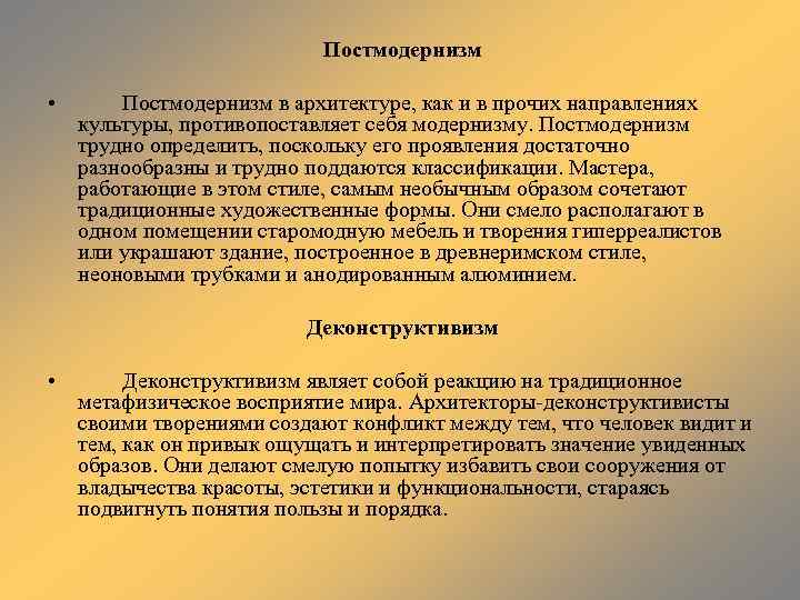 Постмодернизм • Постмодернизм в архитектуре, как и в прочих направлениях культуры, противопоставляет себя модернизму. Постмодернизм трудно определить, поскольку его проявления достаточно разнообразны и трудно поддаются классификации. Мастера, работающие в этом стиле, самым необычным образом сочетают традиционные художественные формы. Они смело располагают в одном помещении старомодную мебель и творения гиперреалистов или украшают здание, построенное в древнеримском стиле, неоновыми трубками и анодированным алюминием. Деконструктивизм • Деконструктивизм являет собой реакцию на традиционное метафизическое восприятие мира. Архитекторы-деконструктивисты своими творениями создают конфликт между тем, что человек видит и тем, как он привык ощущать и интерпретировать значение увиденных образов. Они делают смелую попытку избавить свои сооружения от владычества красоты, эстетики и функциональности, стараясь подвигнуть понятия пользы и порядка.