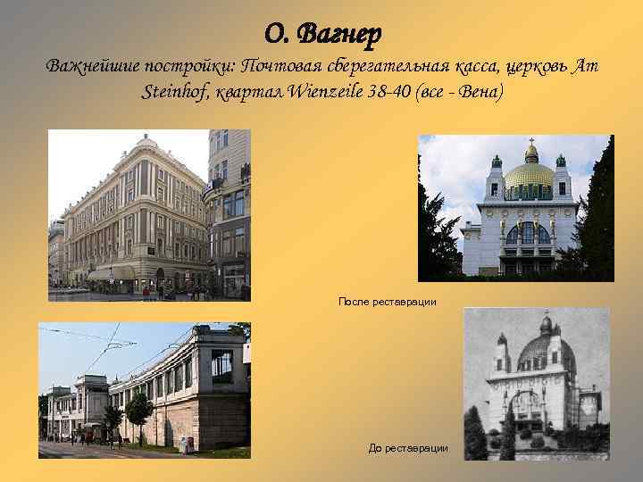 О. Вагнер Важнейшие постройки: Почтовая сберегательная касса, церковь Am Steinhof, квартал Wienzeile 38 -40 (все - Вена) После реставрации До реставрации