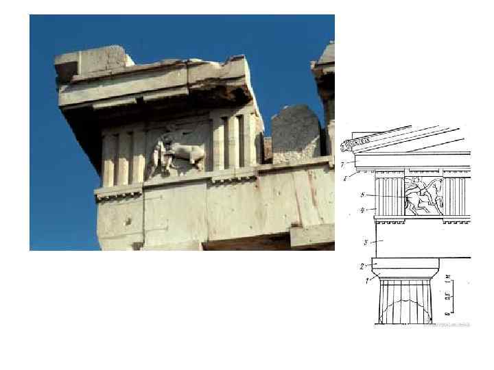 • Темы триглифно-метопного фриза: гигантомахия – состязания олимпийских богов с гигантами, • кентавромахия – борьба греков-лапифов с кентаврами, • амазономахия – битва греков с амазонками и сцены из троянской войны.