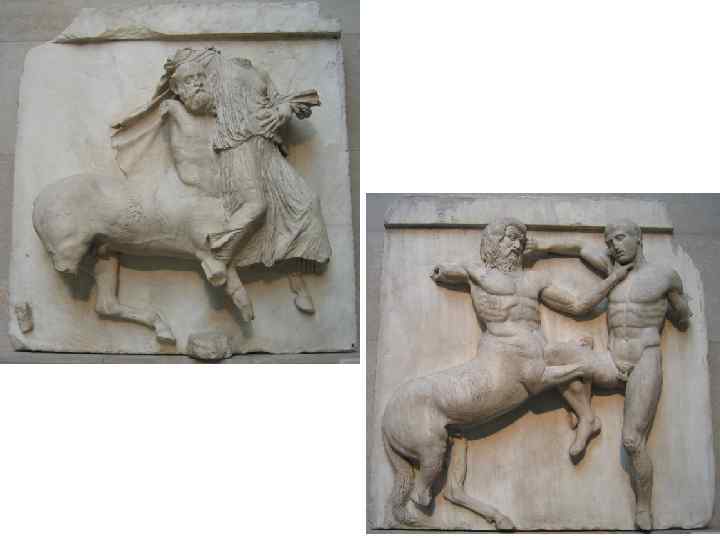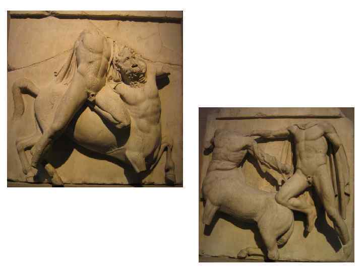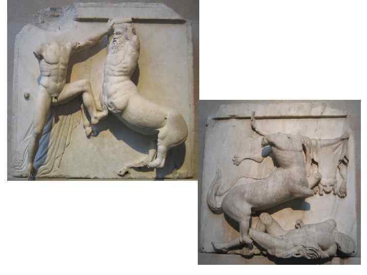 • гигантомахия, с одной стороны, утверждает небесную иерархию; с другой - показывает возможность для человека вмешаться в космические процессы через героическое начало. Уместность этой темы в декоре храма понятна - движение от Хаоса к Космосу, от отсутствия равновесия к его обретению представлялось грекам через самые разнообразные взаимодействия человекоподобных богов и богоподобных людей. • изображение кентавра в античности - символ всего животного, необузданного в человеческой природе, олицетворением дикости и гневливости, буйного нрава и невоздержанности. Поэтому тема кентавромахии - тема победы человека над своими желаниями и похотями. Человек в этой схватке всегда изображается обнаженным.