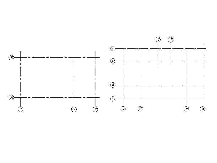 • Вычерчивание плана здания начинают с нанесения координационных осей (рис. 3), которые выполняют на чертежах штрихпунктирными линиями (толщиной S/3 -S/2). • Координационные оси определяют расположение (привязку) основных несущих конструкций (стен, колонн). Расстояния между координационными осями определяются условиями использования стандартных конструктивных элементов: ферм, балок, панелей перекрытий и др. • Для маркировки координационных осей применяют арабские цифры и прописные буквы русского алфавита (кроме Ё, З, Й, О). Цифрами маркируют оси по стороне здания с большим количеством координационных осей. Обычно на планах это горизонтальное направление. Последовательность маркировки осей принимают слева направо и снизу вверх. Обозначения наносят в кружках диаметром 6 -12 мм и, как правило, располагают по левой и нижней сторонам плана здания.