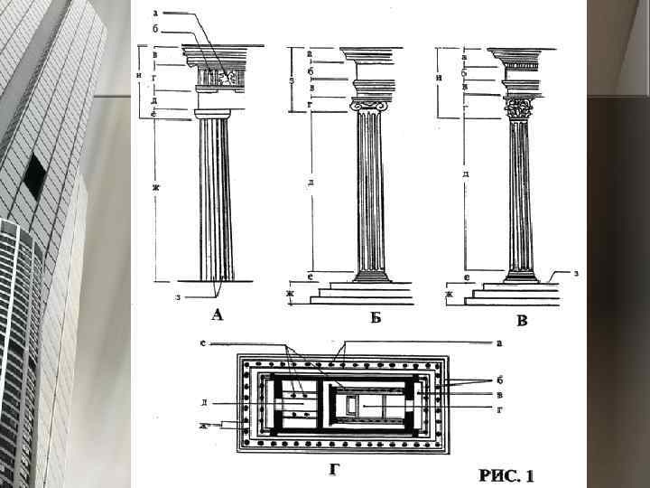 А — дорический ордер: з — метопа, б — триглиф, в — карниз, г — фриз, у — архитрав, е - капитель, ж ствол колоны, з — каннелюры, и антаблемент. Б - ионический ордер: а - карниз, б - фриз, в архитрав, г - капитель, д ствол колоны, е — база колоны, ж стереобат, з - антаблемент. В - коринфский ордер: а — карниз, б — фриз, в — архитрав, г — капитель, д — ствол, е - база колонны, ж стереобат, з - стилобат. Г - план древнегреческого храма: а — колонны периптера, б ступени стереобата, в — пронаос, г — наос (целла), д — опистодом, е - внутренние колонны, ж - интерколумний.