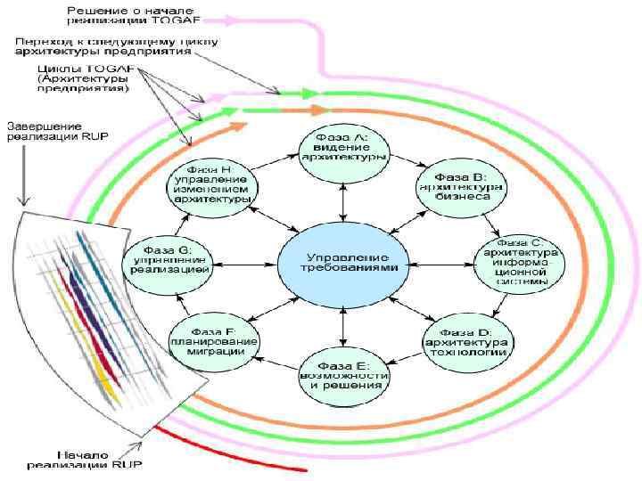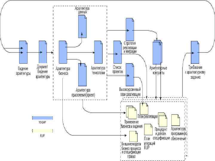 TOGAF - итеративный процесс. Итерации (которые чаще называются циклами) обычно отличаются большей длительностью, чем итерации RUP, и объединяют несколько фаз реализации и обслуживания архитектуры предприятия. Область охвата архитектуры предприятия шире области охвата одного проекта RUP