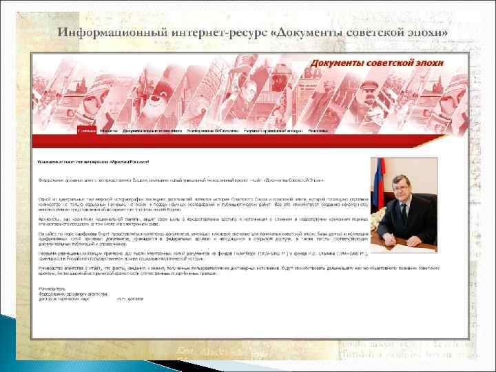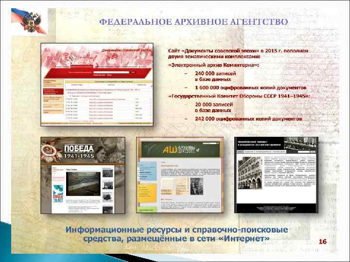 С середины 2000 -х гг. : доминирует тенденция к интеграции тематических ресурсов. Эта тенденция уже была предусмотрена в Концепции информатизации архивного дела (1995): ориентир – на использование общероссийских и международных стандартов для формирования общероссийского информационного пространства на основе интеграции ресурсов отдельных архивов; создание ИПС с возможностью удаленного доступа к БД и электронным копиям документов. «Программа информатизации ФАА и подведомственных ему учреждений на 2011 -2020 г. » (2011) акцентировала внимание на преодолении разрозненности государственных информационных ресурсов в области архивного дела путем их объединения.