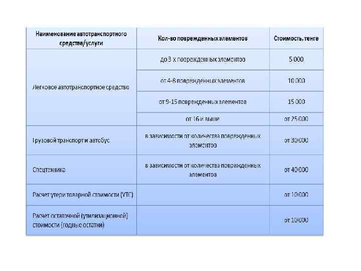 • • Расчет стоимости ремонта (восстановления) поврежденного транспортного средства на дату оценки в месте оценки проводится по формуле: n р м зч зчр • С = SUM (С + С - С ). • • • • • • вос i=1 i i где: n - количество наименований (видов) работ, проведение которых необходимо для восстановления поврежденного транспортного средства до технического состояния, в котором оно находилось непосредственно перед повреждением, на дату оценки, единиц; С - стоимость проведения i-того наименования (вида) работ, iнеобходимого для восстановления поврежденного транспортного средства, на дату оценки в месте оценки, тыс. тенге С - стоимость материалов, используемых при i-том виде работ по восстановлению поврежденного транспортного средства, на дату оценки в месте оценки, тыс. тенге С - стоимость в новом состоянии поврежденных элементов (запасных частей) транспортного средства, подлежащих замене при i-том виде работ по восстановлению поврежденного транспортного средства, на дату оценки в месте оценки, тыс. тенге. ; С - стоимость, по которой могут быть реализованы поврежденные элементы транспортного средства (за исключением затрат на реализацию), подлежащие замене при i-том виде работ по восстановлению поврежденного транспортного средства, на дату оценки в месте оценки, тыс. руб. ; С - величина утраты товарной стоимости на дату оценки в месте оценки, тыс. тенге