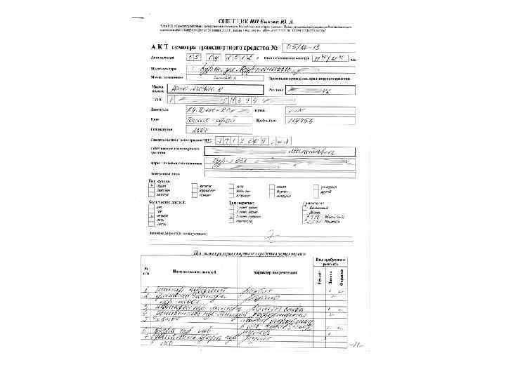 Порядок проведения осмотра и составления акта осмотра поврежденного транспортного средства (ТС): • • • 1. Подача заказчиком заявления оценщику о проведении оценки транспортного средства; заключение с заказчиком договора об оценке; определение цели и задачи оценки; установление количественных и качественных характеристик объекта оценки, согласование с заказчиком требуемого стандарта (вида) стоимости и даты, на которую будет определена стоимость. 2. Идентификация объекта оценки и соответствующих объекту имущественных прав. В первую очередь проводится сверка идентификационного номера, номеров государственной регистрации, номера кузова или шасси и их соответствие номерам в техническом паспорте а также комплектность и оснащенность автомобиля. 3. Составление акта осмотра по видимым повреждениям с применением различных специальных измерительных средств, фотосъемка повреждений. При осмотре устанавливается наличие эксплуатационных дефектов (наличие и степень повреждения частей автомобиля до аварии, степень коррозионных повреждений элементов кузова, состояние лакокрасочного покрытия и другие), определяет, был ли ранее данный автомобиль в аварии, и как ее последствия могли повлиять на его внешний вид, конструкцию, надежность и безопасность. В дальнейшем необходимо установить, производилась ли замена основных узлов автомобиля (кузова, двигателя, коробки передач и пр. ).