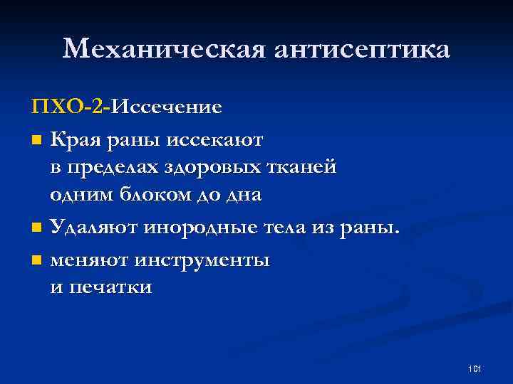 Механическая антисептика ПХО-2 -Иссечение n Края раны иссекают в пределах здоровых тканей одним блоком до дна n Удаляют инородные тела из раны. n меняют инструменты и печатки 101
