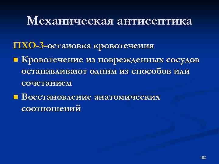 Механическая антисептика ПХО-3 -остановка кровотечения n Кровотечение из поврежденных сосудов останавливают одним из способов или сочетанием n Восстановление анатомических соотношений 102