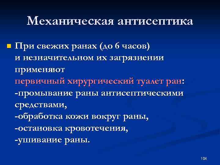 Механическая антисептика n При свежих ранах (до 6 часов) и незначительном их загрязнении применяют первичный хирургический туалет ран: -промывание раны антисептическими средствами, -обработка кожи вокруг раны, -остановка кровотечения, -ушивание раны. 104