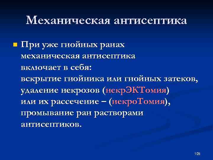 Механическая антисептика n При уже гнойных ранах механическая антисептика включает в себя: вскрытие гнойника или гнойных затеков, удаление некрозов (некр. ЭКТомия) или их рассечение – (некро. Томия), промывание ран растворами антисептиков. 105