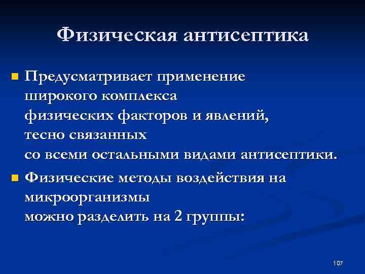 Физическая антисептика Предусматривает применение широкого комплекса физических факторов и явлений, тесно связанных со всеми остальными видами антисептики. n Физические методы воздействия на микроорганизмы можно разделить на 2 группы: n 107